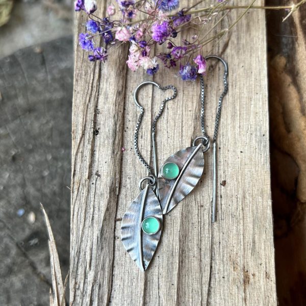 Agat zielony kolczyki to nowa propozycja z tymi kamieniami. Dwa agaty w zielonym kolorze w szlifie gładkim 4mm oprawiłam w srebro próby 925. Srebro w całości postanowiłam przyoksydować, a na koniec je przetarłam. Kolczyki powiesiłam na biglach otwartych. Łańcuszek przewleka się przez otwór w uchu, aż do łuku umieszczonego na środku łańcuszka. Oprawy kamieni umieściłam na ręcznie uformowanych liściach. Kolczyki są celowo asymetryczne. Z tyłu dyndają się łańcuszki.