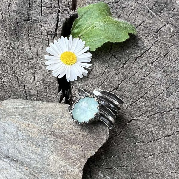 Akwamaryn owalny pierścionek w koronce. Kamyk akwamarynu o wymiarach 10 x 9 mm o lekkiej barwie niebieskiej wybrałam do tego pierścionka. Kamień ma w sobie naturalne spękania, w jednym miejscu jest bardziej przeźroczysty, a w innym mniej przejrzysty. Ma w sobie drobne inkluzje. Kamień ubrałam w oksydowane srebro próby 925, srebro mocno wypolerowałam i przetarłam z oksydowania. Pod kamieniem srebro również wypolerowałam mocno. Dzięki temu kolor kamienia nie jest niczym przytłumiony. Pierścionek jest na falowanej obrączce, z możliwością regulacji rozmiaru. Jest niesymetryczny nieoczywisty, z regulacją na wierzchu a nie pod spodem.