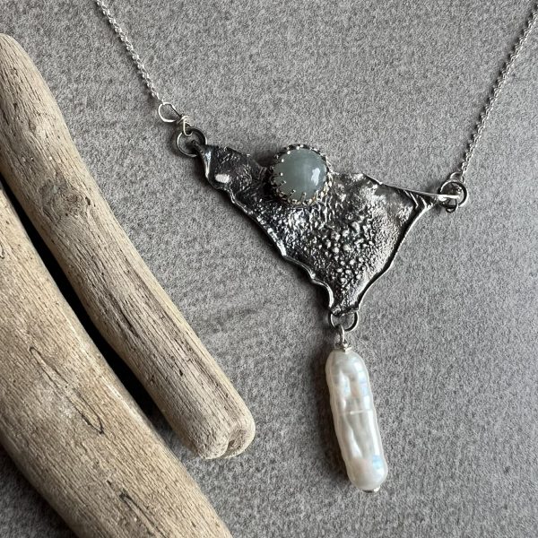 Akwamaryn perła naszyjnik to propozycja zawieszki na łańcuszku z akwamarynem, do stworzenia którego zainspirowały mnie surowe skały. Niewielki akwamaryn o średnicy 9 mm trafił do tego wisiorka w koronkową oprawę.  Niebieski akwamaryn w oprawie umieściłam na fakturowanej bazie. Wisior od podstaw formowałam ręcznie, nadałam mu strukturę przypominającą surowe skały. Element ze srebra ma wymiary  około 53  x 35 mm. Wisior ma konstrukcję asymetryczną. Pod oprawą z akwamarynem dodałam perłę naturalną hodowlaną w kolorze ecru. Wymiary perły to 23 x 7 x 4 mm. Perła porusza się swobodnie pod wisiorem. Od spodu widać jedynie srebro. Całość stworzyłam oczywiście ze srebra próby 925, które na koniec przyoksydowałam, przetarłam, a na koniec wypolerowałam.
