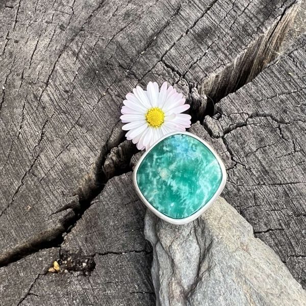 Amazonit pierścionek to propozycja klasycznego pierścionka z połyskującym amazonitem o czworokątnym kształcie. Kamień ma wymiary 19 x 19 mm mierząc krawędzie, ubrałam w stonowane i polerowane srebro próby 925. Kamień zakułam w gładką oprawę, następnie umieściłam na falowanej obrączce z możliwością regulacji rozmiaru. Całość stworzyłam ze srebra próby 925. Obrączkę stworzyłam z wywiniętymi brzegami o szerokości 5mm. Fakturowane srebro przyciemniłam w zagłębieniach obrączki, a na koniec wypolerowałam całość na wysoki połysk. Kamień umieściłam na obrączce po skosie.