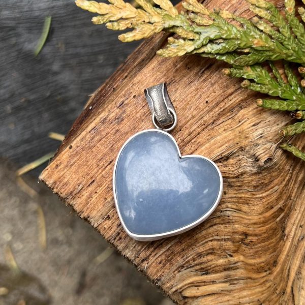 Angelit wisior serce to propozycja biżuterii srebrnej damskiej z tym niezwykłym kamieniem. Fascynujący kolor angelitu, nie przypomina żadnego innego kamienia. Kamień w kształcie serca o wymiarach 24 x 24 mm uchwyciłam w gładką oprawę ze srebra próby 925. Kamień zakułam idealnie w srebro, dopasowałam do kształtu serca. Całość stworzyłam ze srebra próby 925. Od spodu kamień angelitu przykryłam również srebrem i nie widać kamienia od spodu. Oprawę przyciemniłam, oraz zmatowiłam i pozostawiałam w szarym kolorze srebra, następnie dodałam ręcznie formowaną krawatkę. Warto pamiętać iż angelit jest delikatnym kamieniem, nie lubi wilgoci. Wymiary całkowite to 41 x 24 mm wliczając krawatkę. Kamień w oprawie ma 6mm wysokości.