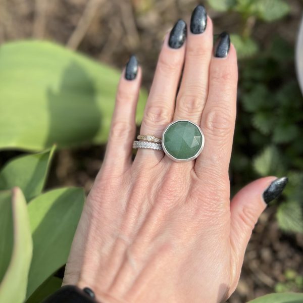 Naturalny Awenturyn pierścionek to biżuteria artystyczna z zielonym awenturynem. Butelkowa zieleń awenturynu koi i zachwyca. Naturalny awenturyn ma średnicę 19mm. Kamień jest kształtu okrągłego w szlifie fasetowanym, oprawę dopasowałam idealnie do kształtu kamienia.   Całość kompozycji stworzyłam ze srebra próby 925. Srebro przyoksydowałam i na koniec przetarłam. Pozostawiłam szarość w zagłębieniach. Kamień awenturynu wystaje ponad oprawę.  Spód kamienia zakryłam srebrem.