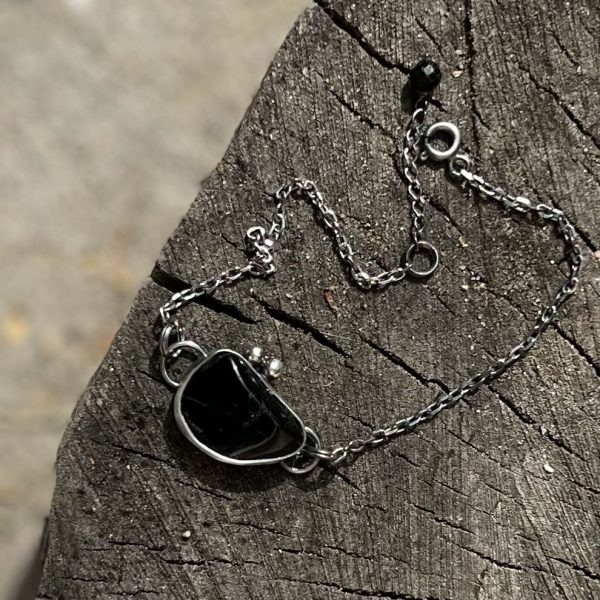 Bransoletka z czarnym turmalinem to delikatna ozdoba na rękę z czarnym kamieniem. Kamień ma nieregularny kształt, dopasowałam ją do kamienia idealnie uwzględniając jego nierówności. Dookoła kamienia pozostawiłam nieregularny brzeg ze srebra. Oprawę dopasowałam idealnie do kształtu kamienia, a do oprawy turmalinu dodałam dwie kulki ze srebra. Całość mocno oksydowałam, a następnie przetarłam pozostawiając szary mat. Na koniuszku bransoletki umieściłam mały turmalinek. Łańcuszek jest masywny nie do zdarcia.
