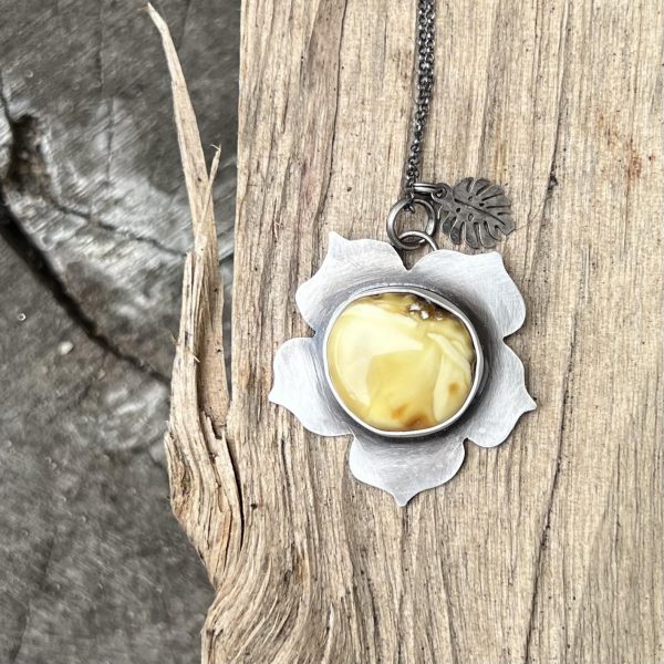 Bursztyn bałtycki kwiatek to najnowsza propozycja wisiorka gotowego do noszenia z mlecznego naturalnego bursztynu.
