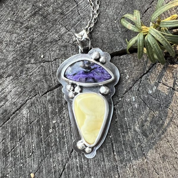 Bursztyn i czaroit wisior to propozycja wisiorka srebrnego z dwóch silnych energetycznie kamieni. W przywieszce umieściłam interesujący czaroit oraz  mleczny bursztyn naturalny bałtycki w kształcie kropli. Czaroit ma wymiary 22 x 10mm,  bursztyn zaś ma wymiary 22 x 14 x 6 mm. Mleczny naturalny bursztyn jest płaski i delikatny, z wzorek przypominającym mgłę. Czaroit ma ciemny fioletowy kolor, czarne inkluzje i fioletowy pasek przez środek.  Element z bursztynem i czaroitem w oprawie ma wymiary 53 x 28 mm, wliczając kółko. Zaś wymiary całkowite wisiora to 60 x 28 mm. Waga 13,14 gram. Wisiorek jest więc konkretnym okazem.