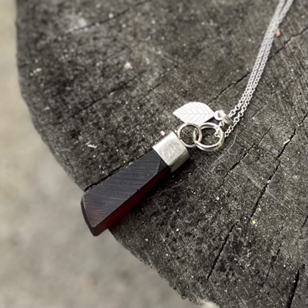 Bursztyn koniakowy wisior w ciekawej formie, oprawiłam w matowe srebro próby 925. Oprawę bardzo minimalnie przyciemniła, a następnie porysowałam pozostawiając mat z cieniem w zagłębieniach rys.