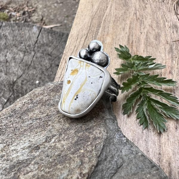 Bursztyn ma w sobie kilka kolorów: biały, szary i żółte paseczki – przenikają się one tworząc unikatową kompozycję. Taka mieszana barwa bursztynu w pierścionku pozwala nosić go w komplecie do wielu sztuk innej biżuterii bursztynowej w różnych kolorach.