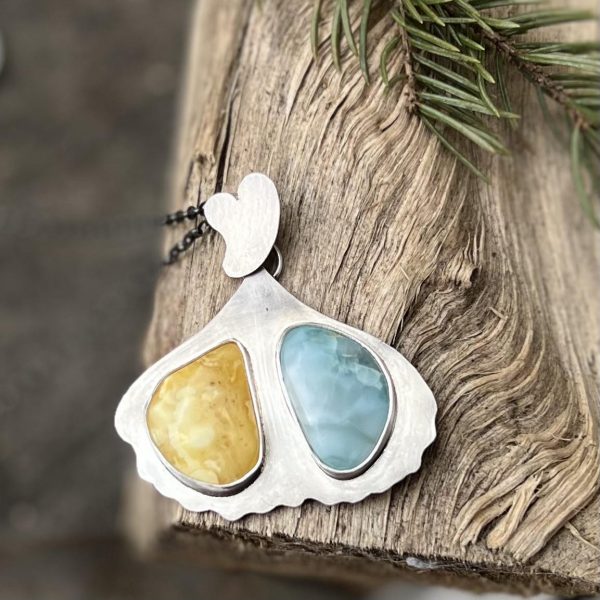 Bursztyn larimar miłorząb to ciekawe polaczenie tych dwóch różnych kamieni. Naturalny bursztyn mleczny w połączeniu z niebieskim larimarem tworzą fascynująca kompozycję.