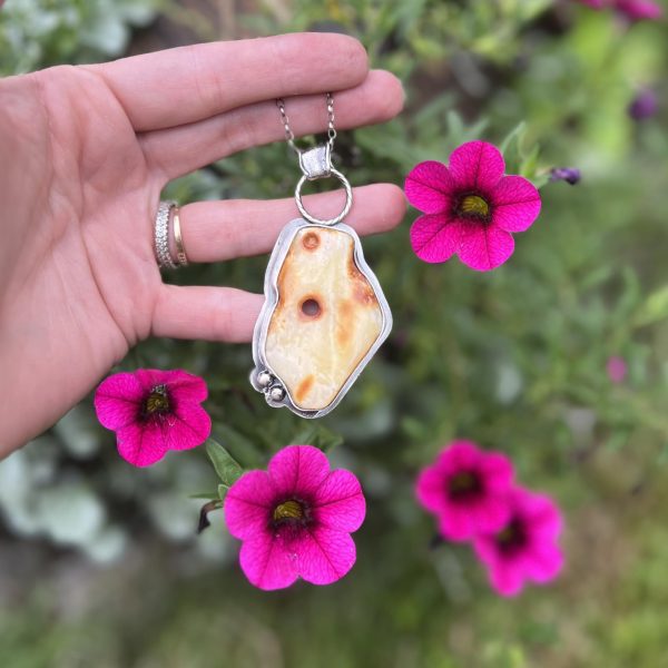 Bursztyn mleczny kropeczki dziurka to propozycja nietuzinkowego wisiora srebrnego z naturalnym bursztynem. Naturalny bursztyn mleczny o nieregularnym kształcie trafił do tego wisiorka. Oprawę bursztynu dopasowałam idealnie do jego kształtu. Tuż przy oprawie bursztynu dodałam dwie kropeczki ze srebra. Bursztyn naturalny bałtycki odkryłam od spodu. Dookoła oprawy bursztynu wycięłam ręcznie ramkę ze srebra, by kompozycja nie była zbyt nudna. Na koniec wisiorek bursztynowy zawiesiłam na krawatce, którą utworzyłam własnoręcznie. Bursztyn w jasnym miejscu został przeszlifowany, zaś na bokach tam gdzie jest rudawy kolor bursztyn pozostawiłam surowy. Zagłębienia w bursztynie są naturalne. Największy urok ma dziurka stworzona przez naturę. Niezwykle rzadko trafiają się okazy z otworem stworzonym przez naturę bez ingerencji człowieka. Okaz jest zdecydowanie unikatowy, ogromną radość sprawiło mi oprawienie takiego bursztynu w nieregularnym kształcie. Lekkie polerowanie bursztynu sprawia iż nie wygląda on jak nudny kolejny owal, nadmierne ścieranie i polerowanie zniszczyło by urok tego złota z Bałtyku.