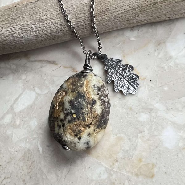 Bursztyn na liściu diament. Kawałek surowego bursztynu wybrałam do tej kompozycji biżuterii. Bryłka przypomina swoją strukturą kawałek ciasta sękacza. Ma wymiary 21 x 16 x 11 mm i przenikające się przyjemne kolory beżów i żółtego oraz szarego. Bursztyn zawiesiłam na szpilce ze srebra próby 925. Bursztyn następnie dodałam do kompletu liść oraz bryłkę surowego czarnego diamentu naturalnego, a na sam koniec zawiesiłam na łańcuszku 45cm. Dodatkowo dodałam liść dębu w całkiem realistycznym wykonaniu.