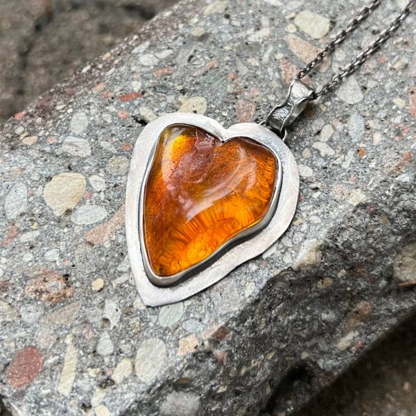 Bursztyn serce wisior to najnowsza kompozycja z naturalnym bursztynem samorodkiem ubranym w srebro. Ciekawy i niejednorodny naturalny kawałek przypomina stworzone przez naturę serce. Postanowiłam ubrać ten bursztyn w srebro próby 925, które mocno oksydowałam i na koniec podrapałam i przetarłam. Bursztyn ma wymiary 31 x 25 mm, zawieszka w oprawie ma wymiary razem z kółeczkiem 51 x 32mm wliczając w krawatkę. Od spodu bursztyn zakryłam srebrem. Waga serca w srebrze z bursztynu to 7,47gram. Kolor bursztynu przypomina koniak lub miód gryczany, przywodzi na myśl zapachy lata.