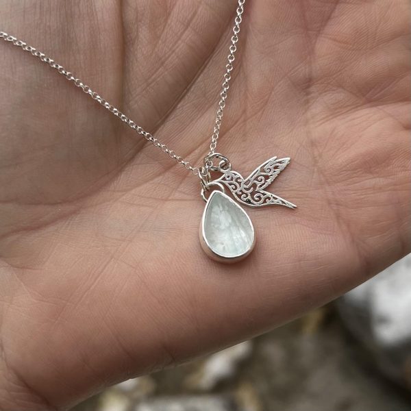 Celebrytka z akwamarynem to naszyjnik gotowy do nałożenia. Główną ozdobą jest kropla naturalnego akwamarynu szlachetnego. Zawieszce z akwamarynu towarzyszy koliberek – magiczny ptak szukający kropli niebieskiego nektaru. Do całości dodałam na koniec łańcuszek o długości 45cm. Całość kompozycji wykonałam ze srebra próby 925. Elementy srebra mocno polerowałam.