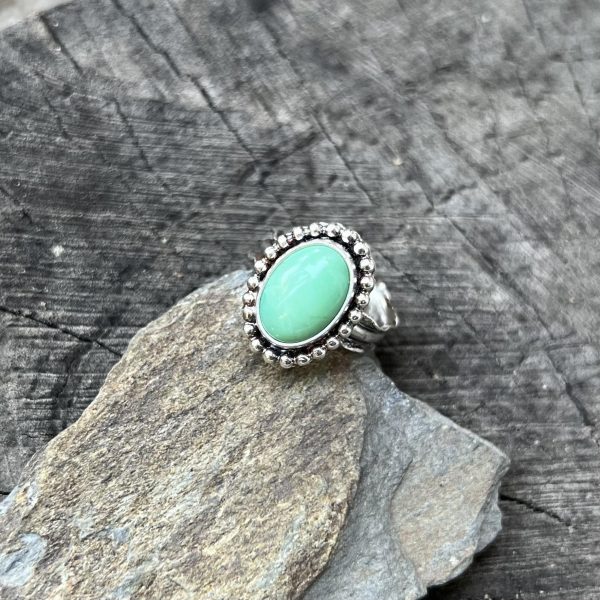 Chryzopraz pierścionek kulki to pierścionek z regulacją rozmiaru. Zgrabny owal naturalnego chryzoprazu o fascynującym kolorze i wymiarach 14 x 11 mm wybrałam do tego projektu. Chryzopraz jest mleczny nieprzejrzysty.