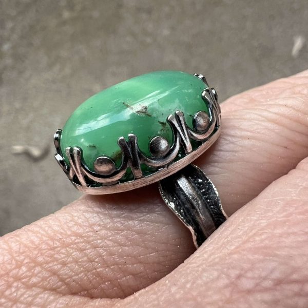 Naturalny chryzopraz jest w kolorze chłodniej zieleni i intensywnej z różnymi plamkami, kamień jest nieprzejrzysty. Kamyk uchwyciłam w koronkę ze srebra próby 925. Następnie oprawę umieściłam na falowanej i regulowanej obrączce o szerokości 5mm. Całość delikatnie przyciemniłam, a następnie na koniec mocno wypolerowałam. Pierścionek zachwyci fankę chłodnych odcieni zieleni, barwa chryzoprazu zachwyca w każdym odcieniu.