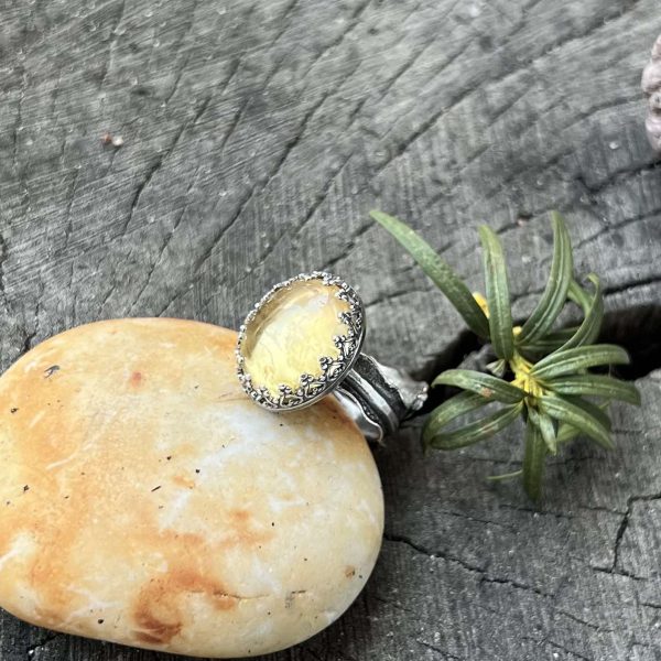 Cytryn pierścionek słońce koronka to pierścień na falowanej obrączce z cytrynem naturalnym. Fascynujący okaz cytrynu naturalnego w owalnym kształcie wybrałam do tego pierścionka damskiego. Naturalny cytryn ma wymiary 14 x 11 i wysokość 6 mm w najwyższym punkcie. Kamień jest dosyć przejrzysty i ma w swoim wnętrzu liczne inkluzje – spękania załamania i ryski. Kamień cytrynu uchwyciłam w koronkową oprawę, ale spora część kamienia wystaje ponad oprawę. Cytryn w ciepłym żółtym kolorze w oprawie umieściłam na falowanej obrączce o szerokości 5 mm. Kamień umieściłam w oprawie symetrycznie i prostopadle do obrączki. Brzegi obrączki lekko wywinęłam, a pierścionek ma możliwość regulacji rozmiaru. Pod kamieniem srebro pozostawiłam jasne, tak by kamień w swoje słoneczne wnętrze łapał jeszcze więcej promieni i energii słonecznej. W zagłębieniach lekko przyciemniłam srebro a na koniec całość mocno wypolerowałam.