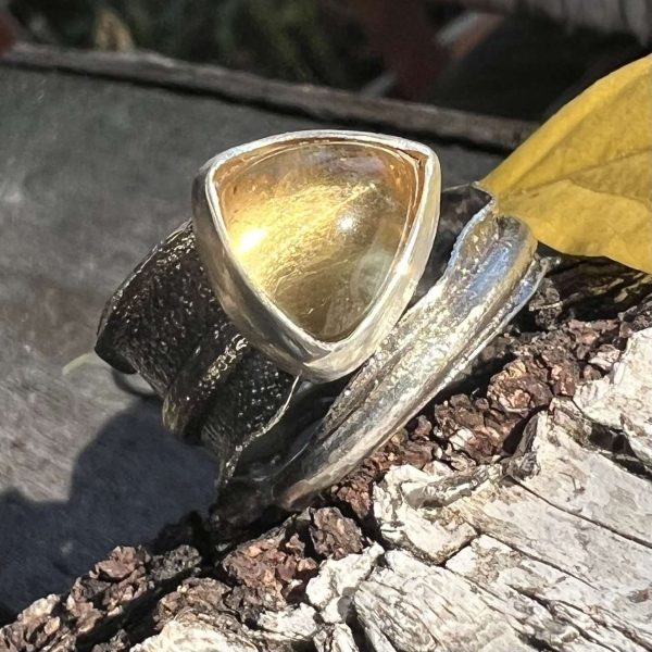Cytryn pierścionek trójkąt to ciekawa propozycja pierścionka z tym kamieniem. Okazały kamień jest wprost doskonały na palec. Trójkątny kształt kamieni cytrynu doskonale wygląda w prostej oprawie. Obrączkę stworzyłam falowaną i przeciętą, a pierścionek pasuje więc na każdy palec. Kamień cytrynu ma wymiary 11 x 11 mm, a wysokość 7mm. Całość wykonałam ze srebra próby 925, które oksydowałam, a następnie przetarłam. Obrączka pod kamieniem jest szeroka i zwęża się ku końcowi. W najszerszym miejscu ma 11 mm szerokości. Obrączka okala palec jak ogonek jaszczurki.
