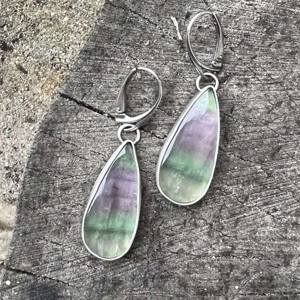 Fluoryt  kolczyki krople to propozycja wiszących kolczyków srebrnych z zielonym z fluorytem. Dwie interesujące krople o wymiarach 27 x 10 mm ubrałam w oprawy z jasnego srebra próby 925. Kamienie fluorytu mają delikatny zielony kolor i filetowe paski. Kamienie od spodu zakryłam srebrem. Naturalne fluoryty są kamieniami, delikatnymi, mają na swojej powierzchni oraz we wnętrzu ryski, załamania inne dziwne rzeczy. Kamienie nie są idealnie przejrzyste. Następnie powiesiłam na prostych biglach wiszących zapinanych angielskich. Długość całkowita kolczyków to 50mm.