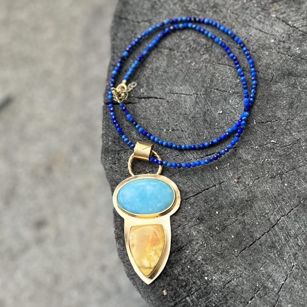 Hemimorfit bursztyn lazuryt złoto to najnowsza propozycja biżuterii artystycznej. W jednej oprawie umieściłam owal hemimorfitu w towarzystwie naturalnego bursztynu w mlecznym kolorze. Całość postanowiłam tym razem ubrać w złote srebro. Naturalny hemimorfit ma wymiary 25 x 15mm, bursztyn naturalny ma wymiary 21 x 14mm. Nad oprawą kamieni umieściłam ozdobne skręcone koło, oraz ręcznie uformowaną krawatkę ze sporym przelotem. Bez problemu możesz przewlec przez nią kolię z kamieni z zapięciem, łańcuszek lub inną bazę czy nośnik wisiora.
