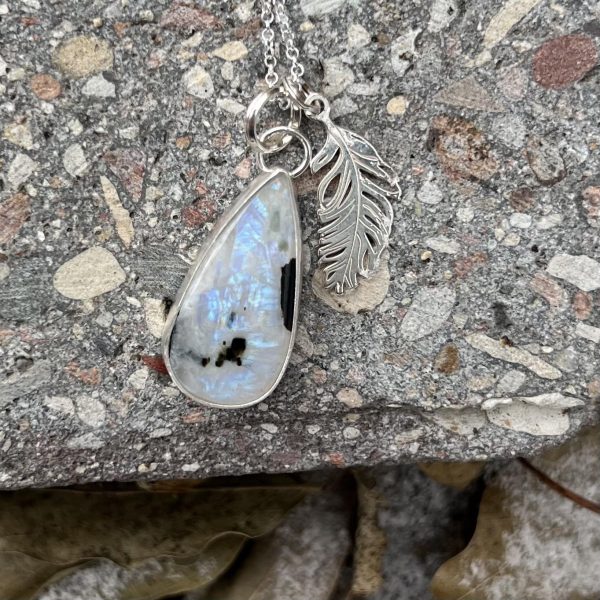 Kamień księżycowy i piórko to kompozycja srebrnego naszyjnika z kamieniem księżycowym. Zgrabną kroplę w białym kolorze z inkluzjami czarnego turmalinu ubrałam w jasne srebro próby 925. Od spodu nie widać kamienia jedynie srebro. Kamień ma niebieską poświatę na powierzchni kamienia, uwidacznia się ona pod wpływem padającego na kamień światła. Kamień księżycowy właśnie swoją nazwę zawdzięcza swojej tajemniczej opalescencji przypominającą światło księżyca.