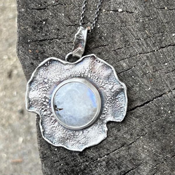 Kamień księżycowy na skale to propozycja kamienia księżycowego w artystycznej oprawie ze srebra próby 925. Księżycowy kamyk o kształcie okrągłym o wymiarach 16 x 16 mm w biało-szarym kolorze oraz o delikatnej niebieskiej iryzacji gra główną rolę w tym projekcie artystycznym. W kamieniu widać inkluzję czarnego turmalinu z jednej strony. Całość wisiora oprócz kamienia to srebro próby 925. Całość formowałam ręcznie, zarówno oprawę jak i krawatkę. Faktura srebra ma niepowtarzalny wzór przypominający skałę. Z pewnością przyciemnianie, przecieranie i polerowanie pozwoliło mi uzyskać interesujące wykończenie srebra. Od spodu kamień zakryłam również srebrem. Wymiary całkowite wisiorka to 42  x 34 mm wliczając krawatkę.