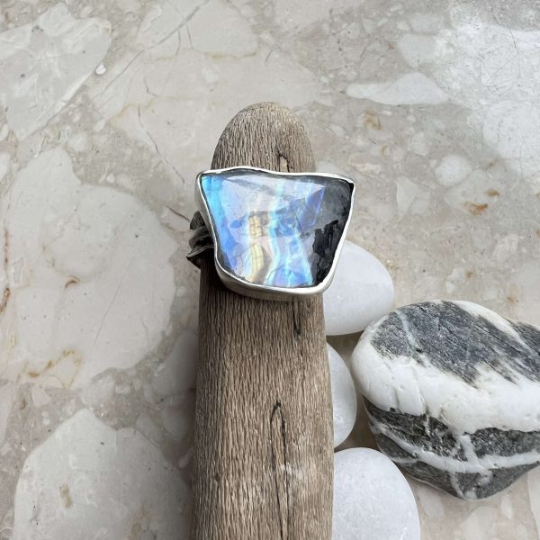 Kamień księżycowy tęcza to niesamowity kamień księżycowy o fascynującej poświacie o wymiarach 18 x 13 x 7 mm i nierównym brzegu.  Ten moonstone umieściłam w pierścionku srebrnym regulowanym. Ten okaz księżycowego kamienia jest półprzejrzysty, oraz ma inkluzje czarnego turmalinu. Kamień wygląda jak kawałek nieba z tęczą. Na powierzchni kamienia jest poświata w dominującym niebieskim kolorze. Kamień ubrałam lekko przyciemnione  i polerowane srebro próby 925. Elegancka gładka oprawa  idealnie okala kamień naturalny o surowym i poszarpanym brzegu. Oprawę kamienia umieściłam na 5mm falowanej i regulowanej obrączce. Z pewnością jest to model pierścionka, który sprawi, że nikt nie przejdzie obojętnie wzrokiem obok niego. Kamień umieściłam w poprzek palca, wzdłuż obrączki.