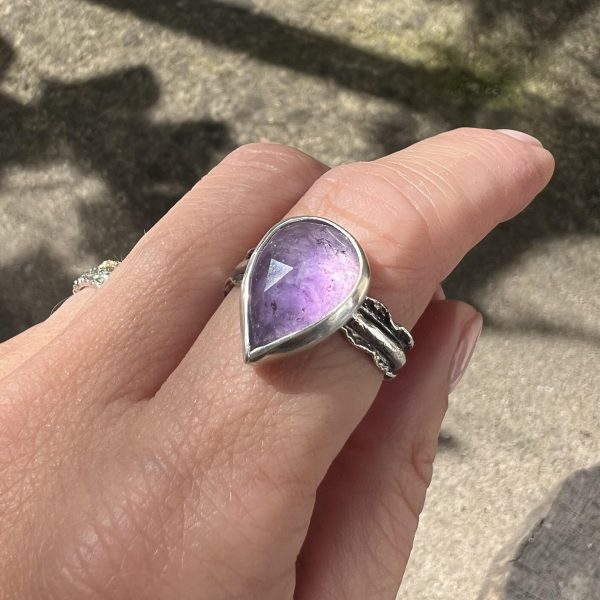 Kropelka ametyst pierścionek to propozycja pierścionka srebrnego z fasetowaną kroplą ametystu w lawendowym kolorze. Kamień o wymiarach 14 x 9 mm oprawiłam w srebro próby 925. Kamień ametystu w oprawie nie jest wysoki ma 5mm wysokości. Dookoła oprawy kamienia dodałam gładkie srebro. Obrączka ma 5 mm szerokości. Pod ametystem mocno wypolerowałam lekko przyciemnione srebro, kamień ametystu jest w środku lekko przydymiony, nie jest przejrzysty. Barwa kamienia zachwyca, przypomina mi kojący zapach lawendy wieczorową porą. Lawenda koi zmysły swoim charakterystycznym zapachem, dokładnie jak kamień ametystu ochłodzi Twoje zmysły. Pierścionek jest idealnym amuletem dla osób kochających naturę, doskonale nada się do kontemplacji miłych wspomnień lata.