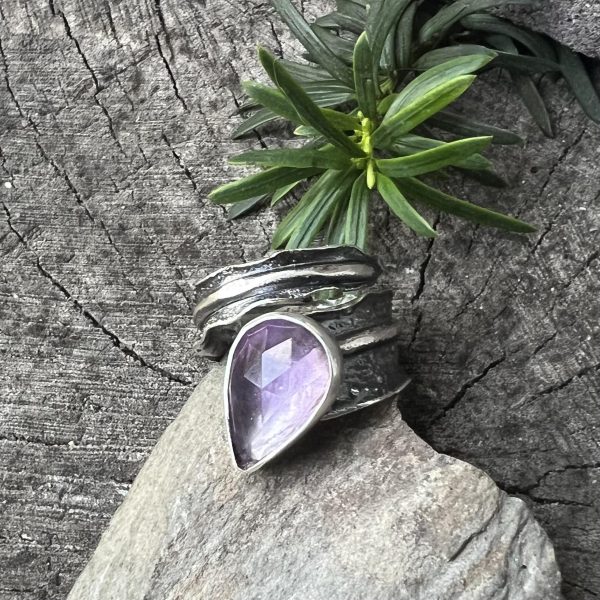 Kropla ametyst pierścionek to propozycja pierścionka srebrnego z fasetowaną kroplą ametystu w lawendowym kolorze. Kamień o wymiarach 16 x 11 mm oprawiłam w srebro próby 925. Kamień ametystu w oprawie jest dosyć wysoki ma 6mm wysokości. Dookoła oprawy kamienia dodałam fakturowaną ramkę nawiązującą do kształtu kamienia. W najszerszym miejscu obrączka ma 13mm. Pod ametystem mocno wypolerowałam lekko przyciemnione srebro, kamień ametystu jest w środku lekko przydymiony, nie jest przejrzysty. Barwa kamienia zachwyca, przypomina mi kojący zapach lawendy wieczorową porą. Lawenda koi zmysły swoim charakterystycznym zapachem, dokładnie jak kamień ametystu ochłodzi Twoje zmysły. Pierścionek jest idealnym amuletem dla osób kochających naturę, doskonale nada się do kontemplacji miłych wspomnień lata.