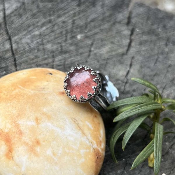 Kwarc truskawkowy pierścionek koronka to propozycja okazałego pierścienia srebrnego z kamieniem naturalnym w srebrze. Kamień o  średnicy  11mm mm trafił do tego pierścionka. Kolor jest typowy dla truskawkowych kwarców. Ubrałam go w jasną koronkową oprawę z polerowanego srebra. Następnie umieściłam na regulowanej i falowanej obrączce. Rozmiar możesz ustawić sama lub napisać na jaki mam ustawić Twój pierścionek. Obrączkę stworzyłam z falowanym brzegiem o szerokości 5mm.