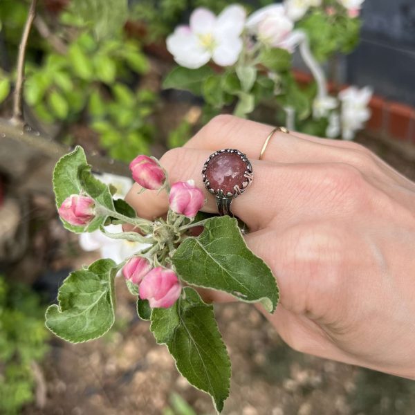 Zagłębienia srebra przyciemniłam, a wypukłe miejsca polerowałam. Z pewnością to ciekawa propozycja biżuterii z kwarcem truskawkowym jeśli potrzebujesz akurat tego kamienia. Zdecydowanie więc polecam.