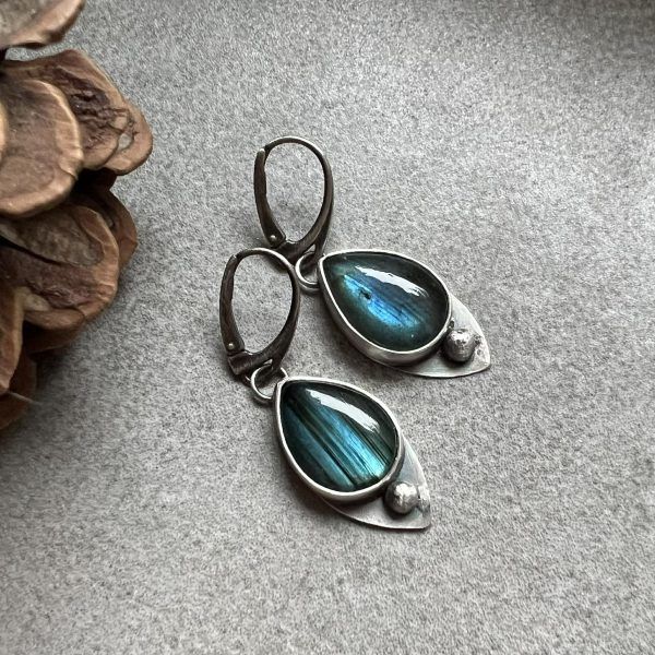 Odkryj kolczyki z niebieskimi Labradorytami, zdobione subtelnymi kuleczkami ze srebra – to kwintesencja mistycyzmu, tekstury i rzemieślniczej pasji: