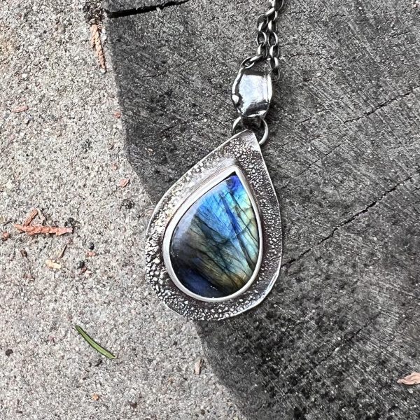 Labradoryt kropla na skale to najnowsza zawieszka z fascynującym labradorytem. Kamień w szarym kolorze w kształcie kropli o wymiarach 24 x 17 mm wybrałam do tej sztuki biżuterii. Kamień ma ryski, kreski i spękania typowe dla labradorytu. Ten labradoryt jest dosyć interesujący. Pod wpływem światła padającego na powierzchnię kamienia ukazuje się labradoryzacja w dwóch wersjach. Z jednej strony ukazuje się jasnoniebieska labradoryzacja, zaś z drugiej strony widać bardziej ciemnoniebieskie plamki.