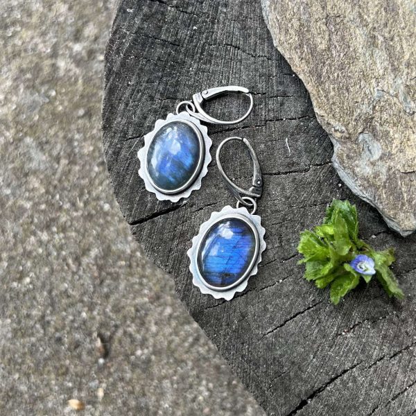 Kamienie mocno zakułam w srebro próby 925. Kamyki powiesiłam na eleganckich i klasycznych biglach zapinanych angielskich. Dookoła kamieni pozostawiłam ramkę ze srebra z ząbeczkami dookoła, by zmienić klasyczny owal w coś nietuzinkowego. Z pewnością to ciekawa propozycja biżuterii artystycznej z labradorytami, która będzie idealnym dopełnieniem stylizacji z udziałem tych kamieni. Magiczne błękitne refleksy i poświata w kamieniu wprowadzą Cię w wyjątkowy, pogodny nastrój w każdej sytuacji.