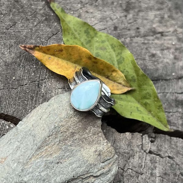 Pierścionek srebrny larimar kropla  – unikat ten stworzyłam z kropli larimaru, którą postanowiłam wcisnąć w gładką oprawę. Obrączkę w falowanym romantycznym stylu o szerokości 7mm wykonałam ze srebra próby 925.  Całość formowałam ręcznie, następnie przyoksydowałam i wypolerowałam. Obrączka jest przecięta, aby pierścionek pasował na każdy palec.  Wymiary  kamyka larimaru 15 x 11mm. Unikat ten zdecydowanie polecam do romantycznych stylizacji.