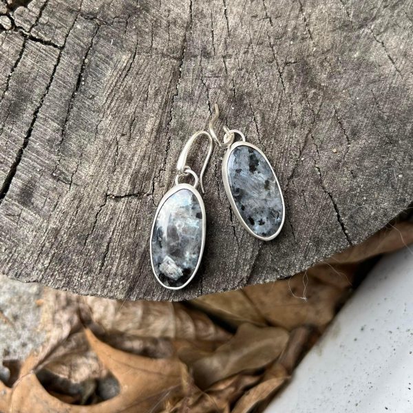 Larvikit kolczyki to propozycja sporych wiszących kolczyków w srebrze. Kwa podobne owale larvikitu wybrałam do tej pary kolczyków. Kamienie mają kolor szary, połyskują miejscami perłowo i srebrno. Kamienie w sobie mają też czarne plamki minerałów.