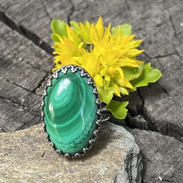 Malachit pierścionek to najnowsza propozycja z tym zielonym kamieniem. Kształt owalny kamienia malachitu o wymiarze 24 x 16 mm, idealnie wpasował się w koronkę. Kamień przybrałam w koronkę ze srebra próby 925. Całość oksydowałam i wypolerowałam na wysoki połysk, następnie przetarłam w niektórych miejscach. Pierścionek stworzyłam z regulacją rozmiaru, aby pasował na dowolny palec. Zieleń malachitu w jasnym odcieniu jest kojąca i pasuje do wielu stylizacji, zarówno do klasyków w kolorach ziemi, ale nie tylko. Idealnie sprawdza się w połączeniu z fioletem, granatem czy fuksją.