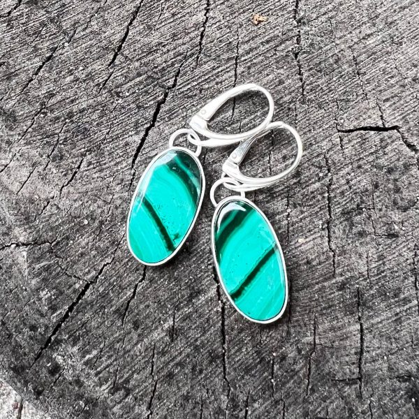 Malachity kolczyki to propozycja dosyć sporych kolczyków z naturalnymi kamieniami. Kamienie malachitu w kształtach owalnych o wymiarze 23 x 11 mm o cieniowanej zielonej barwie w paseczki. Malachit ubrałam w jasne srebro próby 925. Kamienie uchwyciłam w jasną i polerowaną cargę. Kamienie malachitu od spodu zakryłam srebrem. Następnie całość powiesiłam na prostych i eleganckich biglach otwartych. Długość całkowita zaś to 42 mm wliczając bigiel.