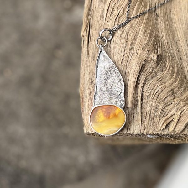 Nowy naszyjnik stworzyłam z gładkiej bryłki bursztynu naturalnego w słonecznym kolorze. Połowa bursztynu jest matowa, a druga połowa przejrzysta. Bursztyn uchwyciłam w gładką oprawę. Całość wykonałam, ze srebra próby 925. Całość kompozycji lekko przyoksydowałam, a następnie przetarłam na koniec zaś wypolerowałam na wysoki połysk. Element nad bursztynem stworzyłam ręcznie, odpowiednio formując srebro, by uzyskać interesującą strukturę.