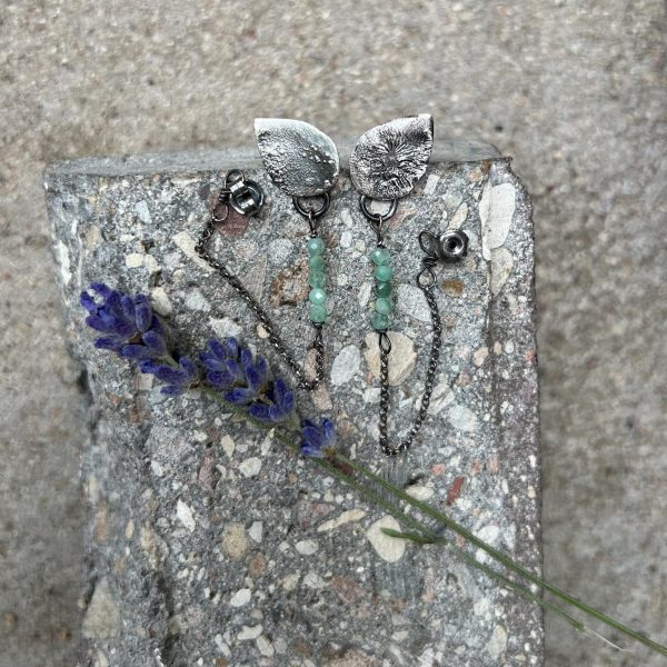 Kolczyki nausznice w kształcie palonych kropelek, można nosić zaostrzonym końcem w stronę małżowiny usznej. Poniżej umieściłam kilka szmaragdów do ozdoby, oraz łańcuszek do którego przypięłam zapięcie sztyftu – baranek. Na pewno baranek się nie zgubi, a pod uchem będzie wisiała zgrabna pętelka. Całość to srebro próby 925, przyciemnione i przetarte.