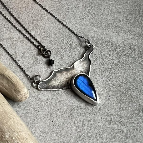 Niebieski labradoryt na skale wisior to najnowsza zawieszka srebrna z labradorytem naturalnym. Całkiem interesująca kropla w kolorze szarym z silną ciemnoniebieską poświatą trafiła to tego naszyjnika artystycznego.