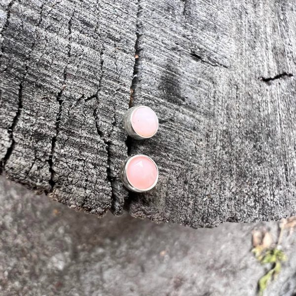 Opal różowy sztyfty rozetki to kolczyki wkrętki jasne srebro średnica kamyka 5 mm. Szlif rozetkowy. Srebro próby 925.