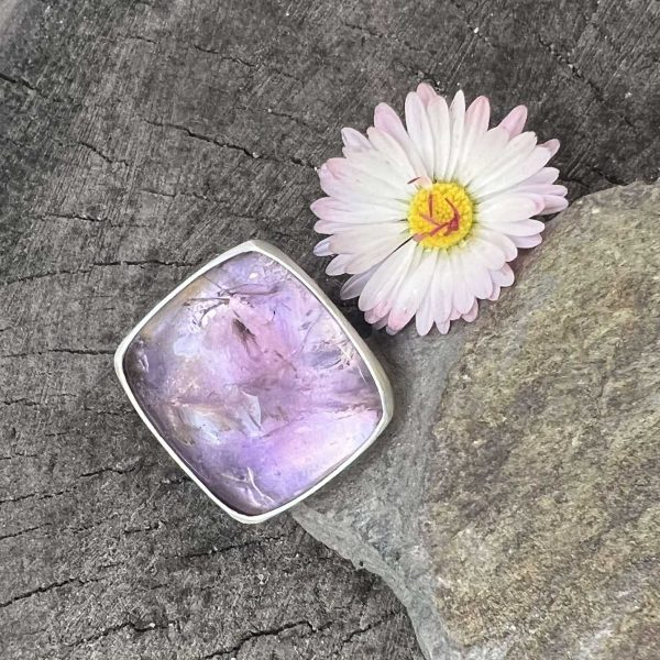 Pierścionek z amertynem to ciekawy okaz biżuterii artystycznej. Amertyn naturalny w kształcie zaokrąglonego prostokąta wybrałam do tego pierścionka regulowanego.  Kamień amertynu ma kształt starego ekranu telewizora z kineskopem. Jest wypukły, gładki i ma n swojej powierzchni dziurki nie jest wypolerowany idealnie na gładko. We wnętrzu kamień  nie jest przejrzysty jak sztuczne szkiełko, na w swym wnętrzu inkluzje. Faktura wnętrza kamienia na myśl przywodzi burzowe chmury, tyle ze w lawendowym kolorze, gdzieniegdzie można dojrzeć odcień żółty cytrynu . Kamień oprawiłam w srebro próby 925. Jak wiadomo amertyn to połączenie cytrynu i ametystu w jednym.