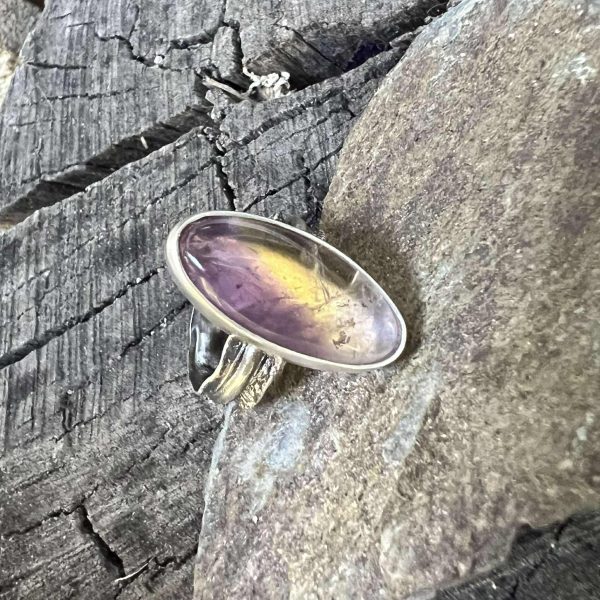 Pierścionek z amertynu to ciekawy okaz biżuterii artystycznej. Amertyn naturalny w kształcie owalnym wybrałam do tego pierścionka regulowanego.  Amertyn jest wypukły, gładki i ma na swojej powierzchni dziurki nie jest wypolerowany idealnie na gładko. We wnętrzu kamień  nie jest przejrzysty jak sztuczne szkiełko, na w swym wnętrzu inkluzje. Faktura wnętrza kamienia na myśl przywodzi burzowe chmury, tyle ze w lawendowym kolorze, gdzieniegdzie można dojrzeć odcień żółty słońca cytrynu. Kamień oprawiłam w srebro próby 925. Jak wiadomo amertyn to połączenie cytrynu i ametystu w jednym.
