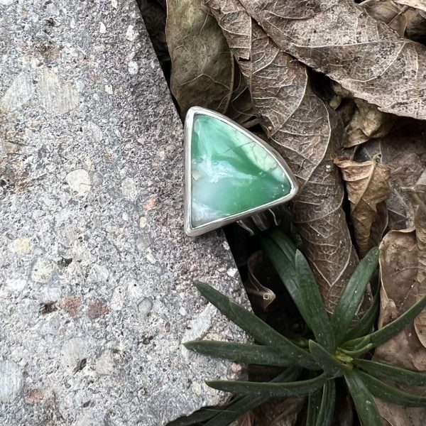 Pierścionek z chryzoprazem to najnowsza propozycja biżuterii autorskiej z tym kamieniem. Kamień w kształcie prawie trójkąta o wymiarach 18 x 16 mm. Kamień ubrałam w srebro próby 925. Oprawę kamienia wykończyłam na gładko, natomiast obrączkę stworzyłam falowaną i przeciętą, tak aby była regulacja rozmiaru. Zagłębienia obrączki przyoksydowałam lekko. Pierścionek mogę ustawić na dowolnie wybrany rozmiar napisz na jaki. Srebro w obrączce stworzyłam tak, aby miało wywinięte brzegi, dzięki temu palec nie odparza się w upalne dni, a pierścionek w noszeniu jest naprawdę wygodny. Chryzopraz w pierścionku nie ma jednolitej barwy, ma w sobie różne plamki. Jakby chmury na niebie tyle że zielonym.