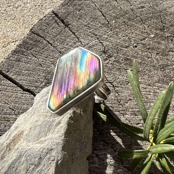 Pierścionek z labradorytem fioletowym to biżuteria artystyczny z tym tajemniczym kamieniem jakim jest labradoryt.  Labradoryt ma kształt kanciastej bryły o  wymiary 23 x 16 mm. Kamień jak każdy labradoryt jest szary, a pod wpływem padającego światła ma kolor fioletowy. Efekt ten kamienia to labradoryzacją, w tym okazie fioletowa, niebieska i żółta w paseczki. Kamień oprawiłam w srebro próby 925, a następnie zamontowałam na 5mm obrączce. Dodatkowo w obrączce wywinęłam brzegi, aby palec nie odparzał się od szerokiej obrączki.