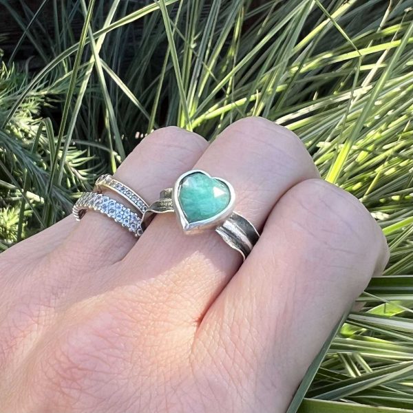 Pierścionek ze szmaragdem – kamyk w kształcie serca o wymiarach 10 x 10 mm ubrałam w srebro próby 925.  Obrączkę stworzyłam falowaną i przeciętą. Pierścionek można nosić na dowolnym palcu.