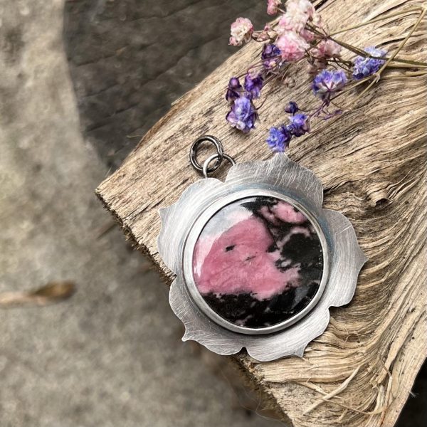 Rodonit wisior to prosta i interesująca biżuteria – fascynująca zawieszka z rodonitem kamieniem miłości. Naturalny rodonit o kształcie okręgu o średnicy 24mm oprawiłam w srebro próby 925. Kamień od spodu również zakryłam srebrem, całość wykończyłam na szary lekki mat, a na koniec zwieńczyłam sporym kółeczkiem zamiast krawatki. Rodonit mają ciekawą ciemnoróżową barwę, z czarnymi plamkami gdzieniegdzie. Zdecydowanie ten kamień jest urokliwy. Jeśli poszukuje rodonitu, to ten kamień jest dla Ciebie.