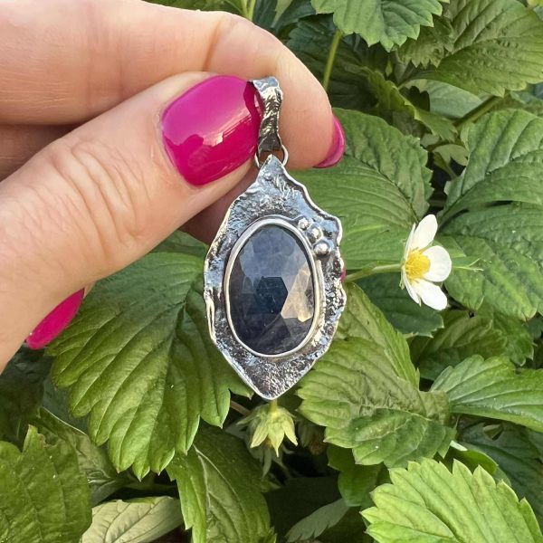 Szafir niebieski wisior to unikatowa kompozycja z pięknym naturalnym szafirem. Kamień o pięknym szlifie fasetowanym, o granatowej barwie i delikatnym połysku uchwyciłam w srebro. Całość jest próby 925, srebro formowałam ręcznie, oksydowałam, przetarłam, a następnie dodałam trzy kulki ze srebra obok oprawy kamienia. Kamień szafiru szlachetnego zakryłam od spodu srebrem. Dodatkowo ręcznie formowaną krawatkę.