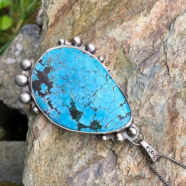 Turkus jest naturalny i o pięknej barwie niebieskiej z naturalnymi żyłkami. Kamień oprawiłam w jasne srebro próby 925, które przyoksydowałam i wypolerowałam.