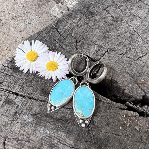 Turkus owale kropeczki to klasyczne kolczyki do noszenia w uchu z naturalnymi turkusami. Kamienie w kształcie owalu o wymiarach 16 x 12 mm ubrałam w jasne srebro próby 925. Kamienie mają ciekawą barwę i mają prawie lustrzane odbicie wzoru. Naturalne kamienie turkusy zakułam mocno w oprawie, następnie pod oprawami umieściłam po trzy kulki ze srebra z czubkiem, który optycznie wydłuża owal kamienia.