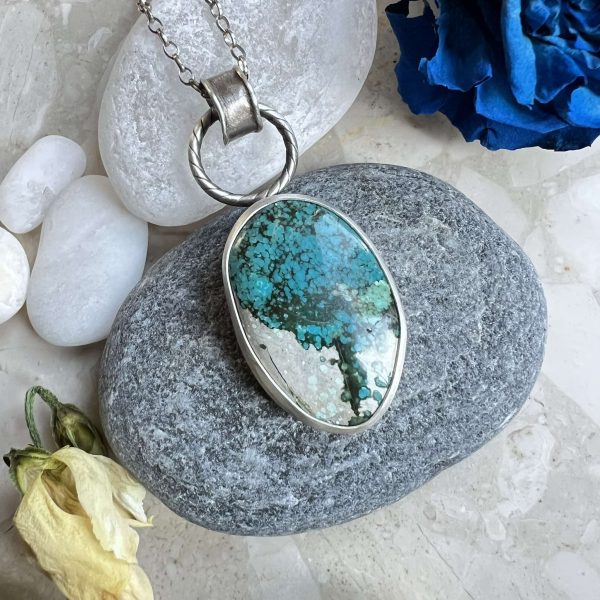 Turkus wisiorek to biżuteria artystyczna srebrna z interesującym owalnym naturalnym turkusem. Kamień turkusu o wymiarach 31 x 21 mm ubrałam w srebro próby 925. Na wierzchu umocowałam skręcone koło oraz ręcznie utworzona krawatkę. Naturalny turkus zakułam mocno w oprawie. Całość lekko przyciemniłam i wykończyłam na mat. Od spodu kamień również zakryłam srebrem.